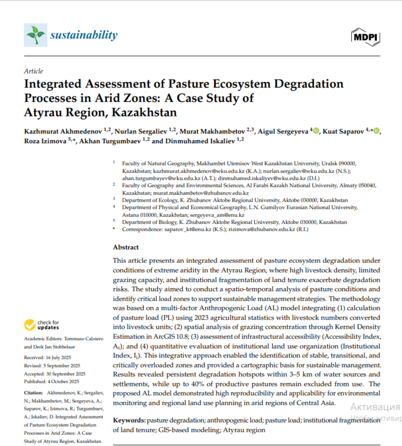 Мақалаға сілтеме: Akhmedenov, K.; Sergaliev, N.; Makhambetov, M.; Sergeyeva, A.; Saparov, K.; Izimova, R.; Turgumbaev, A.; Iskaliev, D. Integrated Assessment of Pasture Ecosystem Degradation Processes in Arid Zones: A Case Study of Atyrau Region, Kazakhstan. Sustainability 2025, 17, 8869. https:// doi.org/10.3390/su17198869