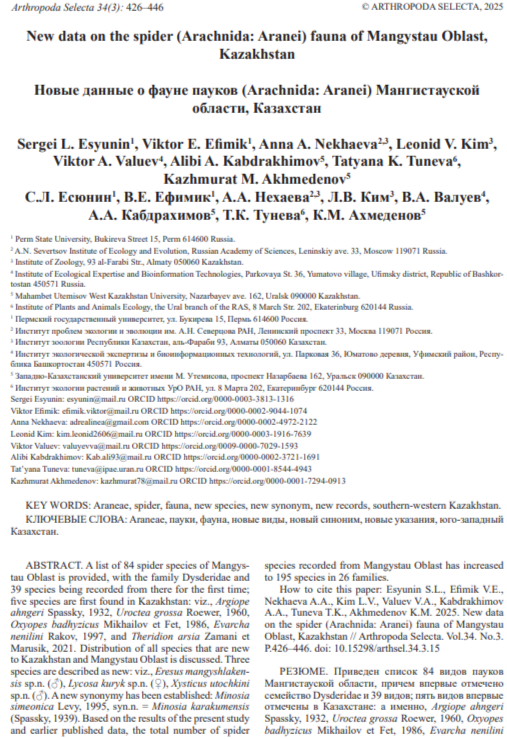 Esyunin S.L., Efimik V.E., Nekhaeva A.A., Kim L.V., Valuev V.A., Kabdrakhimov A.A., Tuneva T.K., Akhmedenov K.M. 2025. New data on the spider (Arachnida: Aranei) fauna of Mangystau Oblast, Kazakhstan // Arthropoda Selecta. Vol.34. No.3. P.426–446. doi: 10.15298/arthsel.34.3.15